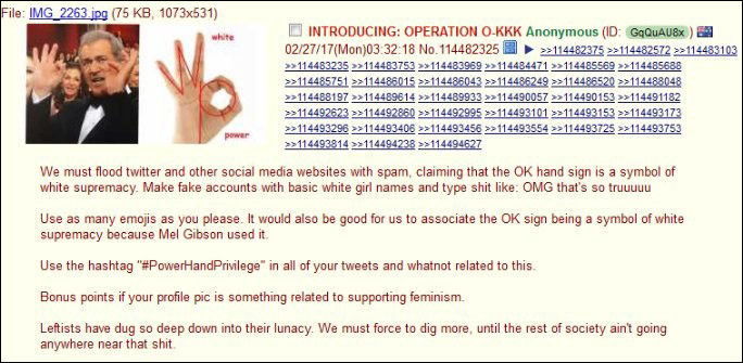 2017年,美國在線論壇4chan政治板塊的一份匿名帖子提出發起“O-KKK行動”,呼籲廣泛使用這種與“OK”意思相近的手勢,將其作為一種嘲諷梗,“引發自由派人士過度反應”,直到社會上其他人已經“習慣到不會聯想到白人至上主義”。
