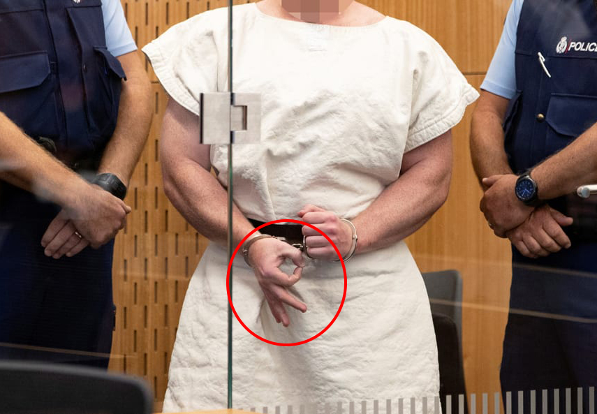 媒體給他拍照時進行了面部打碼,但據《新西蘭先驅報》稱,塔蘭特竟當着鏡頭面露微笑,還猖狂打出被認為象徵“白人至上”的種族主義手勢。