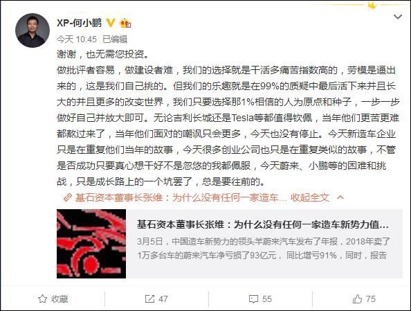 (觀察者網訊)對於基石資本董事長張維昨日發文提出中國沒有任何一家新能源造車企業值得投資的言論,小鵬汽車董事長何小鵬3月19日通過微博賬號@XP-何小鵬 回應稱,做批評者容易,做建設者難,我們的選擇就是幹活多痛苦指數高的,勞模是逼出來的,這是我們自己挑的。但我們的樂趣就是在99%的質疑中最後活下來並且長大的並且更多的改變世界,我們只要選擇那1%相信的人為原點和種子,一步一步做好自己並放大即可。無論吉利長城還是Tesla等都值得欽佩,當年他們更苦更難都熬過來了,當年他們面對的嘲諷只會更多,今天也沒有停止。今天新造車企業只是在重複他們當年的故事,今天很多創業公司也只是在重複類似的故事,不管是否成功只要真心想幹好不是忽悠的我都佩服,今天蔚來、小鵬等的困難和挑戰,只是成長路上的一個坑罷了,總是要往前的。