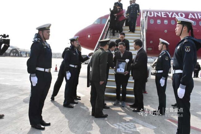 長空肅穆,大地悲泣。3月18日下午,粘金鑫烈士骨灰迎接儀式在青島流亭國際機場舉行。萊陽有關市領導到現場迎接。
