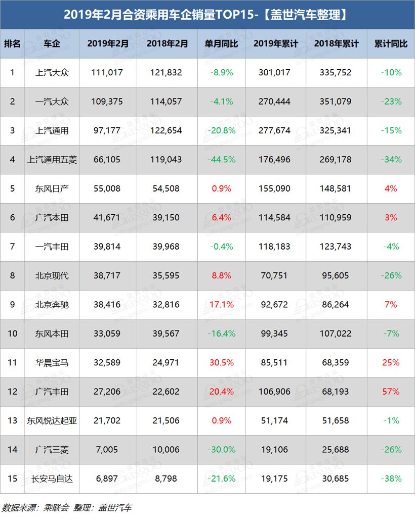 在2月份乘用車企銷量TOP15榜單中,前三席分別被上汽大眾、一汽大眾和上汽通用奪得。吉利繼續穩居第4,上汽通用五菱排名第5。長城汽車和長安汽車分別排名第6和第7,東風日產排在第8,上汽乘用車第9,廣汽本田排名第10。後五席則依次被一汽豐田、北京現代、北京奔馳、東風本田和華晨寶馬佔據。