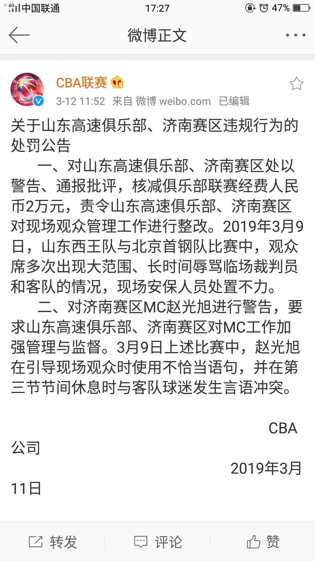 北京時間3月12日,CBA公司公佈了一張對山東男籃的處罰公告:山東主場迎戰北京的比賽中,由於觀眾席多次出現辱罵裁判和客隊球員的情況,CBA公司對山東男籃俱樂部予以處罰,罰款2萬元,並對山東MC進行警告。