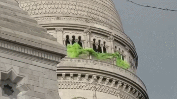 在巴黎,他們避開了香街,前往蒙馬特高地。途中,“黃背心”示威者聚集在聖心大教堂,揮舞着手中的旗幟和橫幅,甚至在教堂外扯起黃布。