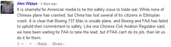 Alex Wijaya:把航空安全問題與美中貿易戰聯繫起來是美國媒體的恥辱。中國並沒有發生墜機事故,然而卻有多名中國乘客在埃航空難中喪生。很顯然,波音737MAX已經不是一個安全的機型,波音公司和FAA(美國聯邦航空管理局)並沒有履行好確保航空安全的職責。正如中國民航監管當局的一位官員所説,“中國一直在等FAA首先採取行動,可是如果FAA無法完成自己的工作,那我們只好替他們做了”。