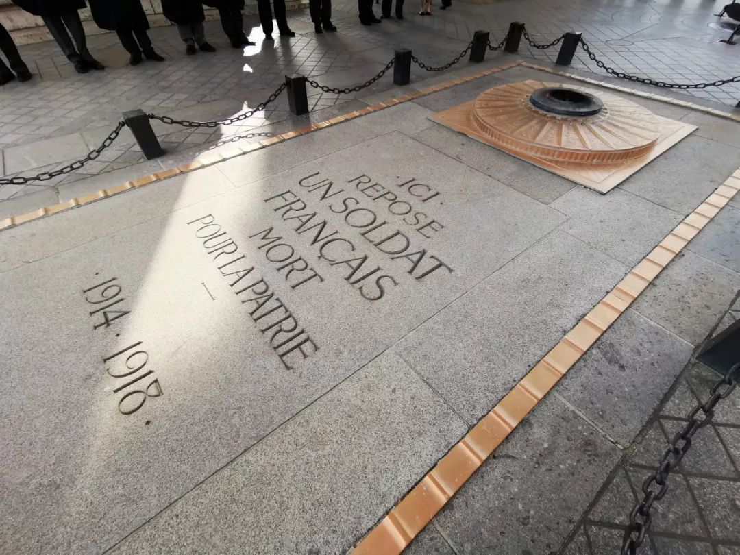 △凱旋門下的無名烈士墓。法國議會1919年以隆重安葬一名無名烈士的方式悼念150萬名在一戰中陣亡的法國官兵。無名烈士墓建於1920年11月11日(一戰停戰兩週年紀念日),其上銘刻“這裏安息着一名為國捐軀的法國士兵”,並從1923年11月11日起點燃長明火。(央視記者張曉鵬拍攝)