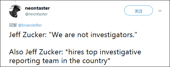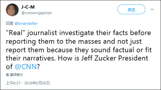 被直接諷刺“不做調查”,CNN首席記者斯特爾特(Brian Stelter)坐不住了,在推特回應道,“蒂姆,你侮辱了千千萬萬努力工作的記者們。扎克的意思很清楚:他在把調查2016年‘通俄門’事件的聯邦調查人員和做報道的記者做對比。”