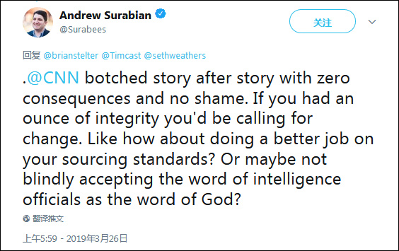 斯特爾特的一番解釋有用嗎?當然還是沒用。有網友繼續回覆他道,“CNN寫了一篇又一篇拙劣的報道,絲毫不承擔後果,絲毫不感到羞辱。但凡你們有一點誠實在,都會做出改變,比如説提高自己消息來源標準?或者説不要盲目信任那些情報官員的話,把他們的話當成上帝之言?”