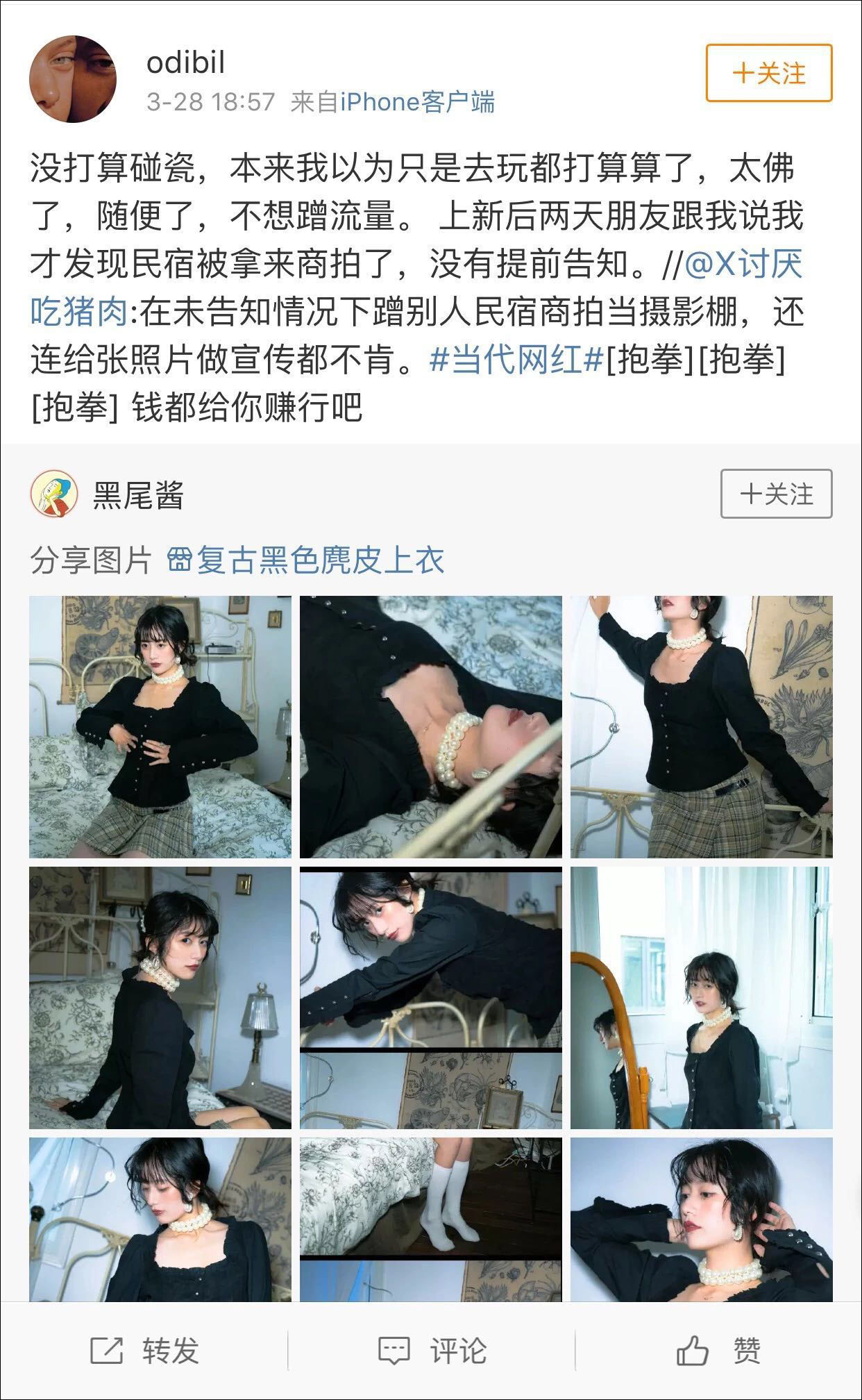 據北京青年報報道,起因系近日一民宿房東發帖爆料稱,自己的房間出租給黑尾醬一行人後,在不知情情況下,被對方用來進行商業拍攝。發帖者稱,商業拍攝行業規矩默認需提前告知場地,並進行溝通,對方以出行居住為由租下房間結果卻用來拍攝網店宣傳照片,未免不太合適。