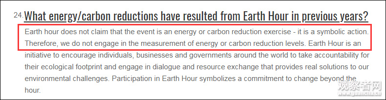 對於這一點**,組織該項活動的世界自然基金會也毫不避諱,官網的“常見問題回答”中就指出:“地球一小時”活動並不是一項節能實踐——只是一個象徵性活動。**