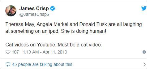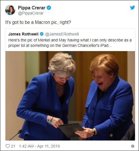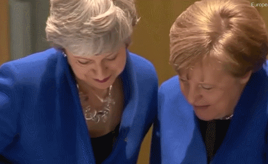 據《華盛頓郵報》10日報道,當天的歐盟峯會上,默克爾拿着自己的iPad給正被脱歐搞得焦頭爛額的特蕾莎·梅看,不知道上面是什麼內容,但梅看了之後,和同樣穿着藍色衣服的默克爾一起哈哈哈大笑。