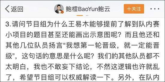 3月24日,雲之隊隊長鮑雲又發表的一篇文章。他同樣質疑節目有黑幕,因為節目組不僅成立了編劇組,製片人桑潔此前還聲稱節目使命就是“包裝腦力偶像”。