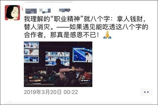 對此,鮑雲迅速予以反擊:他曬出了桑潔20日發的朋友圈,上面寫道:“我所理解的‘職業精神’就是拿人錢財,替人消災。”