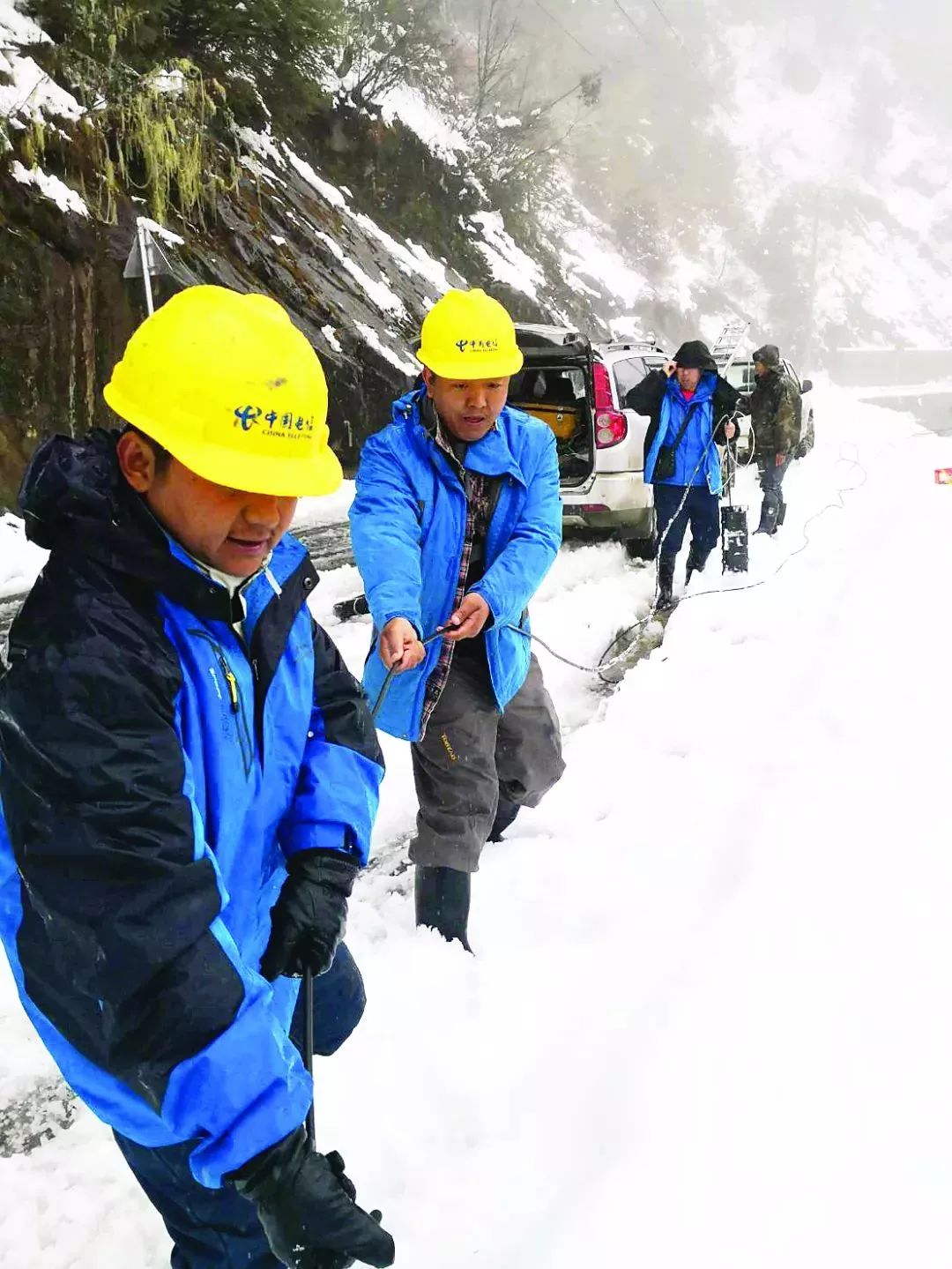 中國電信員工在大雪封山的季節,將光纜拉進獨龍江