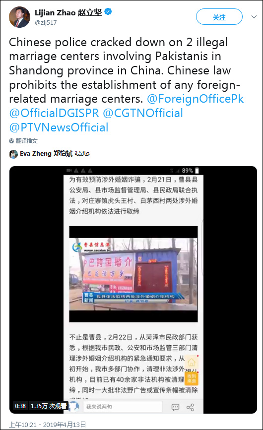 當地時間13日,中國駐巴基斯坦大使館臨時代辦趙立堅在社交媒體發佈消息稱,今年2月,中國山東省菏澤市曹縣依法取締兩家與巴基斯坦相關的涉外婚姻介紹機構。