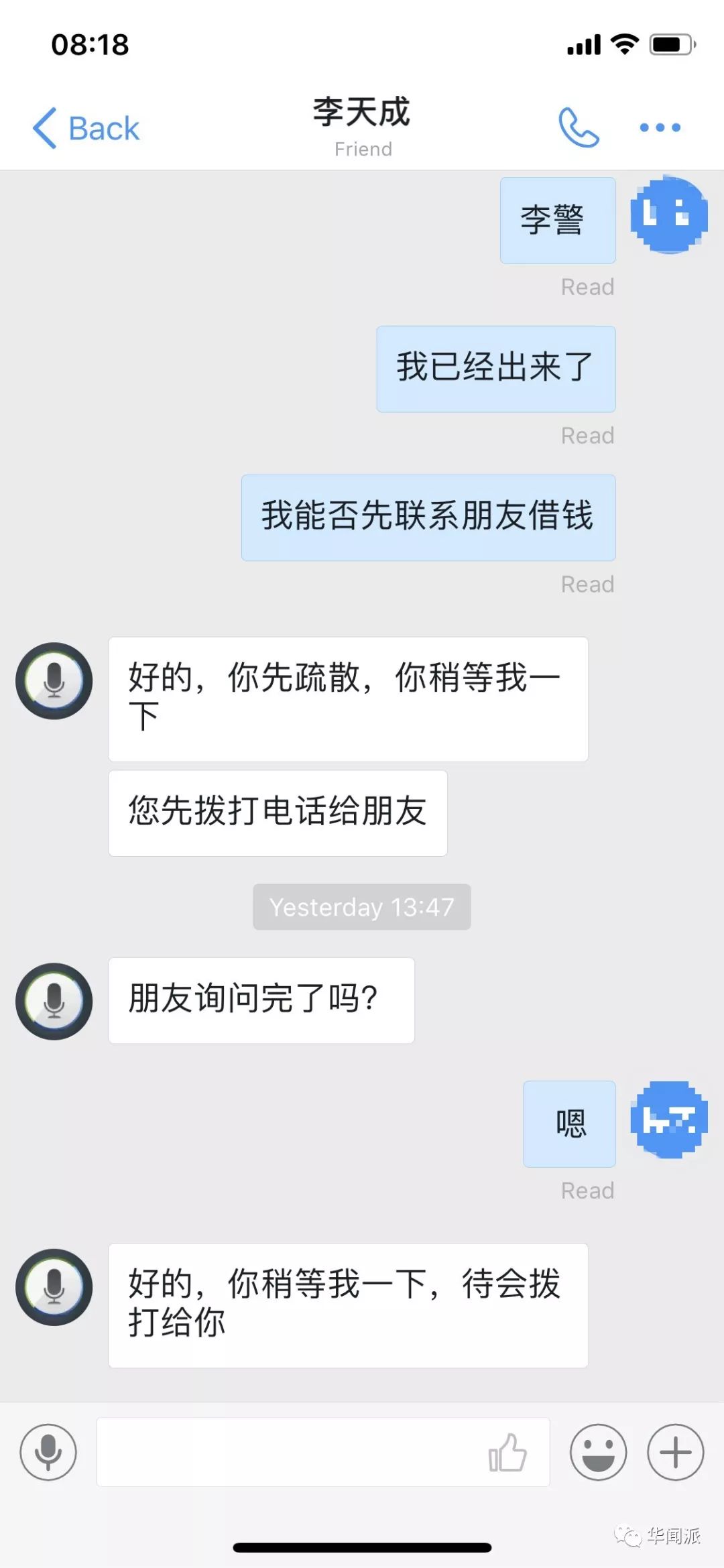 終於在通話四個⼩時後, 小胡和假警官的通話暫時掛斷了。在疏散時,小胡看到了一個熟人 ,便⽴⻢問他借⼿機打國際電話給他爸。