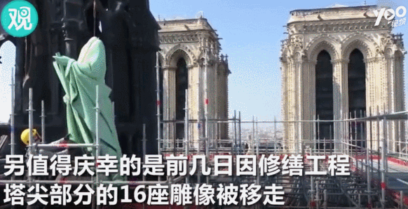 另外,值得慶幸的是,前幾日因為修繕工程,塔尖部分的16座雕像已經被移走。而塔尖則未能免於大火,不幸坍塌。