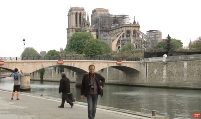 第二天,太陽依舊升起,照向經歷了一夜大火的巴黎聖母院。塞納河畔,有人遠遠地舉起相機……