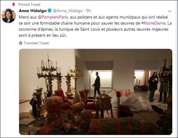 巴黎市長安娜·伊達爾戈在推特上感謝所有參與搶救的工作人員:“感謝巴黎的警察和市政人員,他們在今晚組成為巨大的人鏈,拯救了聖母院的作品。荊棘王冠,聖路易斯的束腰外衣和其他幾件重要的作品現在都在一個安全的地方。”