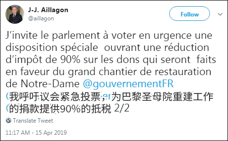 他提出,應通過立法將巴黎聖母院視作“國家寶藏”(national treasure),從而將重建捐款的抵税額度提升至90%。