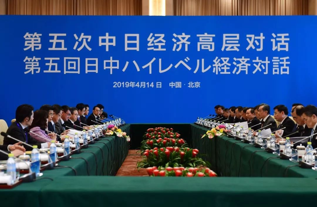 4月14日第五次中日經濟高層對話在北京召開,中國國務委員兼外交部長王毅和日本外相河野太郎共同出席了會議。