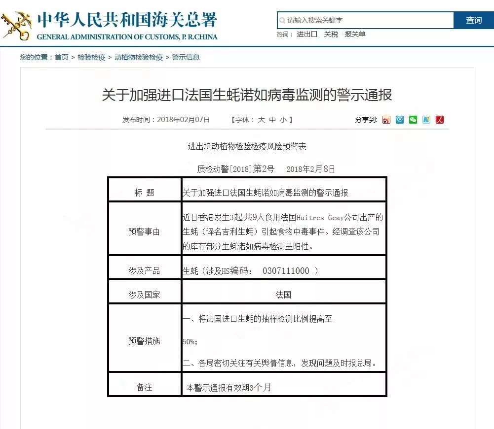 加強進口法國生蠔諾如病毒監測的警示。圖片來源:中華人民共和國海關總署