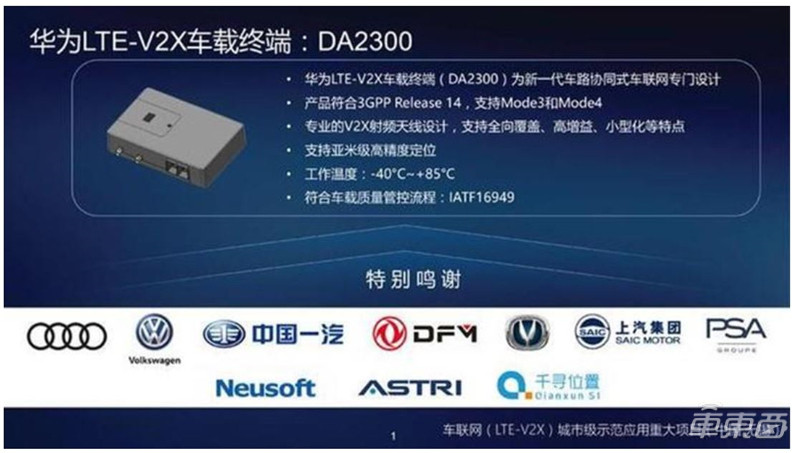 在國內,2018 年 9 月召開的世界物聯網博覽會上,奧迪、大眾、一汽、東風、長安、上汽等汽車廠商,均發佈了搭載華為 LTE-V2X(基於移動通信技術演進形成的車聯網無線通信技術)車載終端的汽車,並進行了 V2X 智慧交通場景演示。華為 LTE-V2X 車載終端成為國內首個在開放道路上成功應用的 LTE-V2X 車聯網終端。