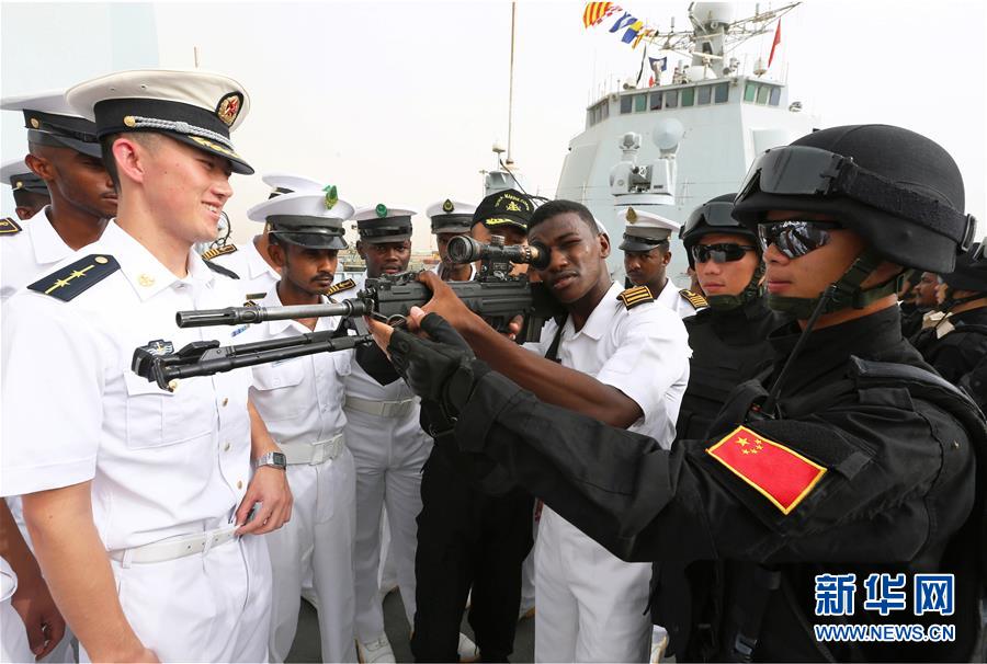 2015年8月27日,中國海軍152艦編隊訪問蘇丹紅海州期間,蘇海軍學院學員參觀濟南艦時,親身體驗特戰隊員的武器裝備。新華社發(代宗鋒 攝)