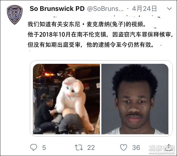 當時“兔子”接受NBC記者採訪稱,他看到一名男子在毆打女子便衝了上去。隨後,新澤西州南布朗士維克警方在社交網站發佈通告,稱這名裝扮成“兔子”的男子,在2018年10月因偷車被警方通緝,並且仍然在逃。