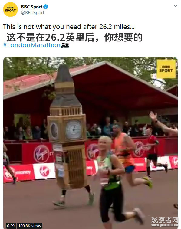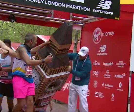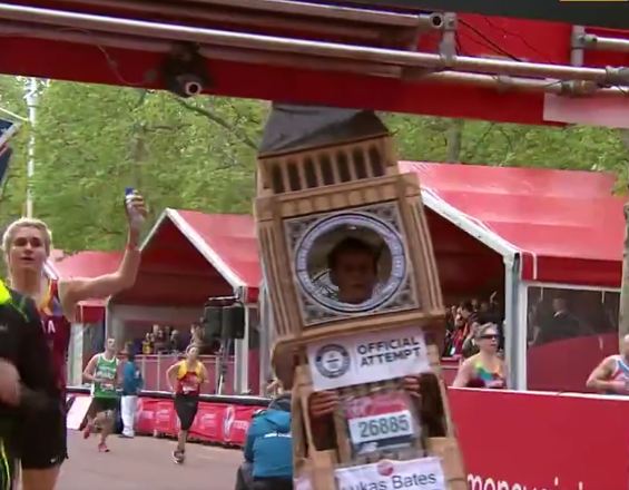 據美聯社4月28日報道,當天,在倫敦的馬拉松比賽中,英國人盧卡斯·貝茨試圖打破“穿着標誌性建築服裝跑馬拉松”的世界紀錄。他把自己裝扮成了“大本鐘”,在跑了全程26.2英里(42.2千米)後,竟然,被終點線卡住了。