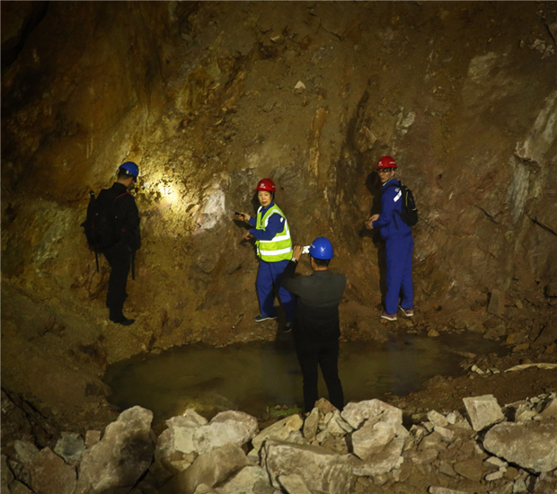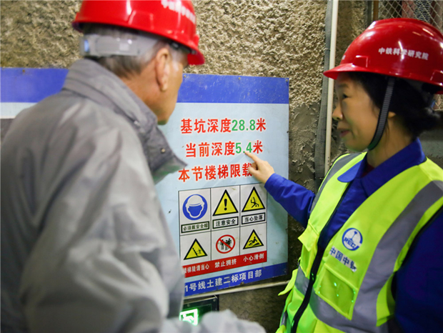 嚴金秀向年近80歲的國際隧道協會前主席艾納.布洛克先生提醒豎井當前深度 圖自人民網