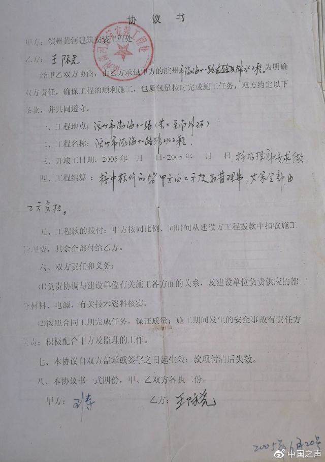 王際堯與黃河建築安裝工程處此前簽訂的合作協議王際堯與黃河建築安裝工程處此前簽訂的合作協議。圖片來源:中國之聲