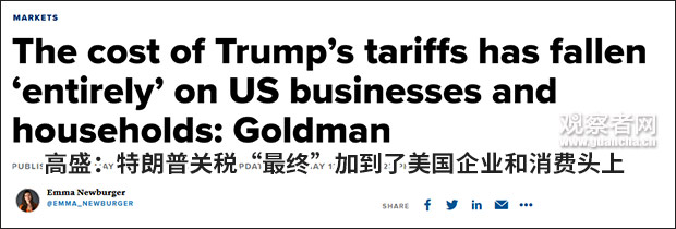 高盛補刀:關税成本完全轉嫁到了美國企業和家庭頭上
