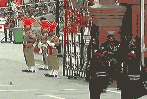 在印巴分治時,位於印度和巴基斯坦交界處的旁遮普地區被分別劃分給了兩個國家。而隨着印巴關係持續緊張,兩國位於該地區的三個口岸每天舉行的降旗儀式也成了舉世聞名的“奇觀”:每一天傍晚,兩國士兵都要在各自觀眾的注目下氣勢洶洶地衝向邊境大門,並做出誇張的高抬腿的高難度動作向對方示威。