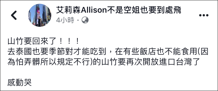 近日,台灣“行政院農委會“稱,將修正檢疫規定使新鮮山竹有條件進入台灣後,不少台灣民眾都表示非常興奮,還有人稱,“我要哭了,感動!”、“超期待”,還有網友表示“小時候的最愛”、“説真的,我都快忘記它的味道了”。