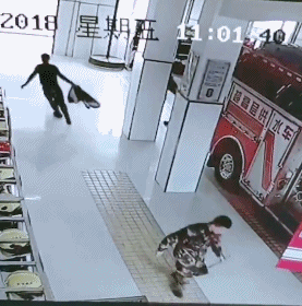 地板濕滑在加上消防員們跑得太快,結果一個個都剎不住車接連摔飛出去……這可真是拖地拖出了“前無古人後無來者”的水平了。