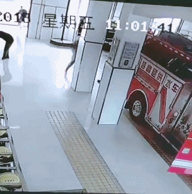 仔細一看,原來在視頻最初,警鈴響起瞬間,有一個拎着拖把的小哥哥正在迅速跑走。