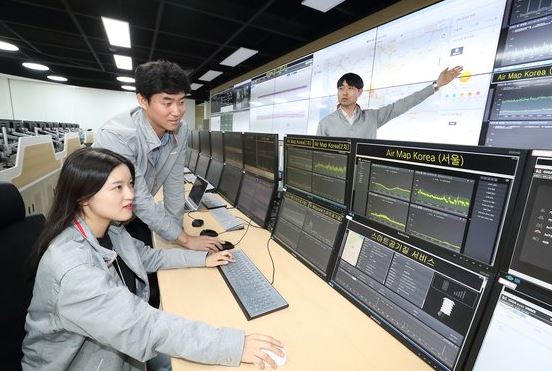 圖為韓國電信公司(KT)的工作人員正在京畿道果川全國空氣質量控制中心確認電線杆傳感器收集的空氣質量數據。