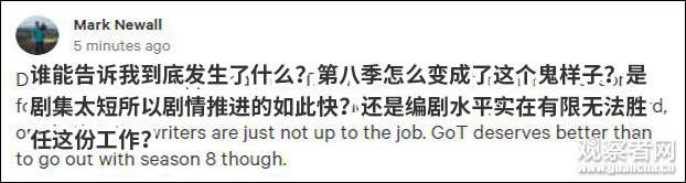 有網友質疑,第八季這是怎麼了?戰鬥永遠沒有策略,都是一窩蜂衝上去,人物性格也變得荒謬,簡直就是在侮辱觀眾的智商。