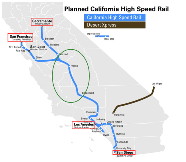 加州高鐵項目,紅框中為原定計劃連接的幾大城市,綠色圓圈內是現任州長紐森削減項目後剩下的一小段 原圖來自洛杉磯時報