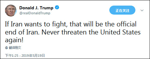 波斯灣局勢持續升温。美國總統特朗普19日深夜發推警告稱,“伊朗一旦開戰,將會是伊朗的正式終結。不要再威脅美國!”