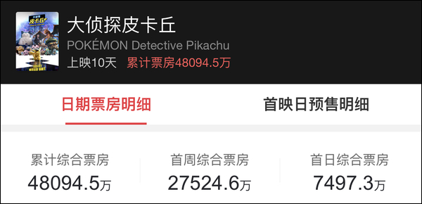 改編自任天堂3DS同名遊戲,也是全球首部真人寶可夢電影的《大偵探皮卡丘》,自5月10日正式在國內上映。據貓眼專業版顯示,該片上線後便票房持續增長,截至目前,《大偵探皮卡丘》已累計獲得票房4.8億元。