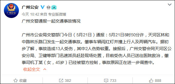 據廣州市公安局交警部門通報,5月21日8時50分許,天河區林和中路林樂路口發生一起交通事故。肇事車輛闖紅燈並撞上行人及兩輛汽車。
