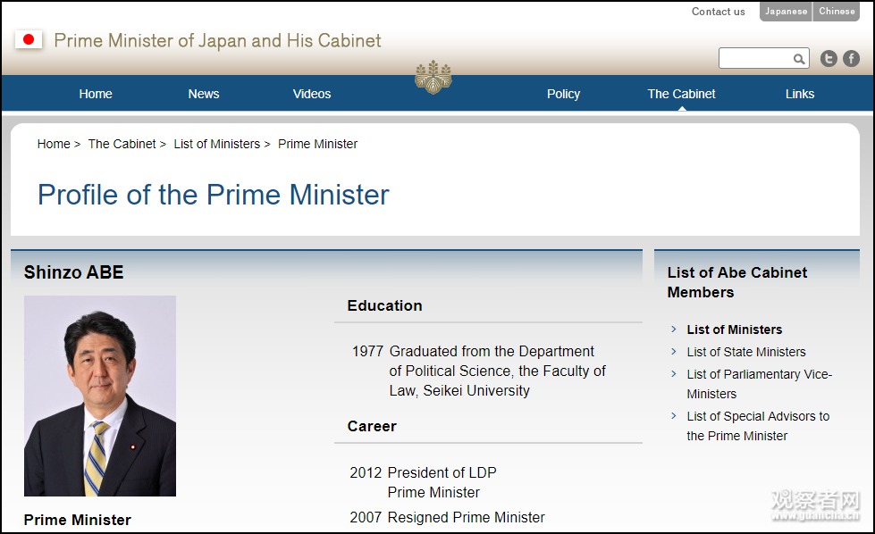 日本首相官邸網站英文頁目前是“名前姓後”,採用Shinzo Abe的寫法。這也是日本政府的通行做法。(網站截圖)