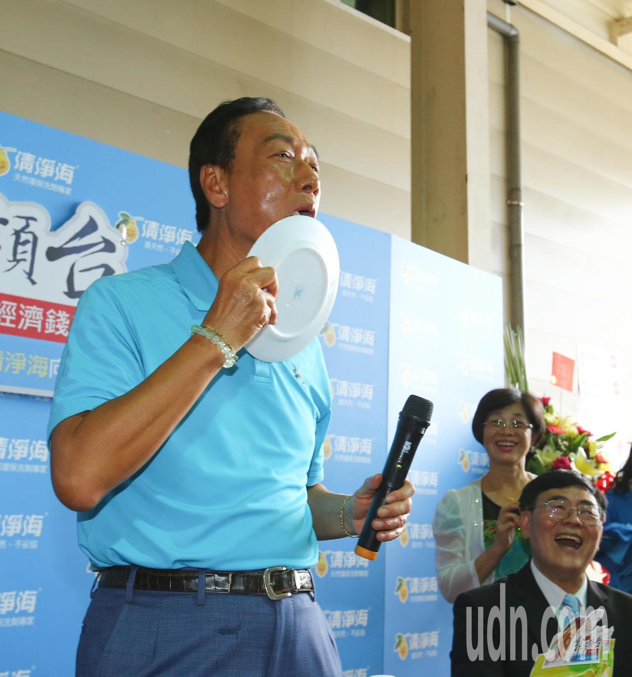 今日上午,郭台銘參觀桃園一生產清潔用品的公司,進入公司內部後,他親自把洗衣膠囊放入水瓶內搖晃,3分鐘後挽起袖子,用清潔劑洗盤子,還拿出隨身帶的手帕將盤子擦拭乾淨,又張嘴舔了幾下,見證洗潔的效果很好。