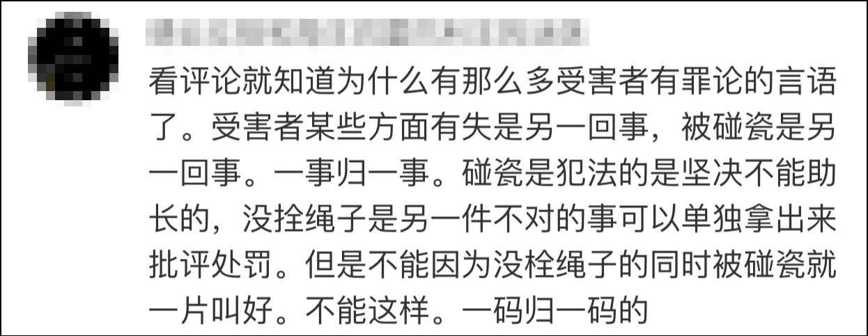 隨後,這種説法遭到另一部分網友的反駁:受害者做得不對是一回事,被碰瓷是另一回事,一碼歸一碼,碰瓷這種行為堅決不能助長。