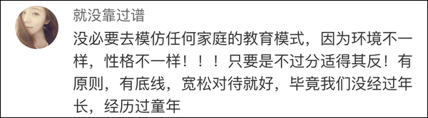 但他們更為這種在普遍家庭教育理念中“不同尋常”的方式點贊,呼籲更多的家長能夠學習這種開明寬容的教育理念,在不違背原則的基礎上,給孩子們更多空間和尊重。