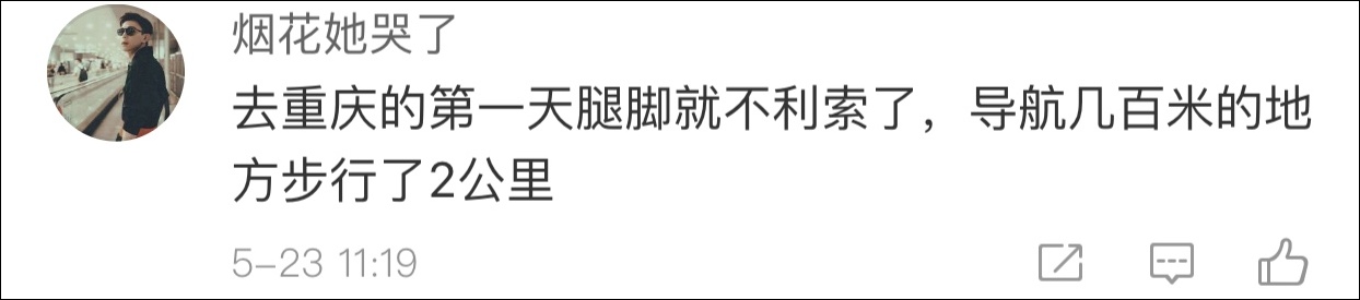 有網友回憶,去重慶玩,第一天腿就不利索了,導航幾百米的地方步行了2km;