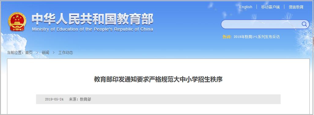 據教育部網站5月24日消息,24日,教育部下發《關於嚴格規範大中小學招生秩序的緊急通知》(下稱《通知》),對義務教育入學、高中招生、中職學校招生、高考報名等提出一系列規範要求。