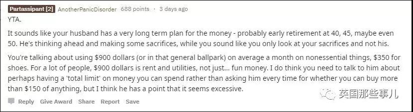 假如單筆花銷超過150美元,她必須和丈夫商量之後才能購買。妻子對此頗為不滿,“我想出去買件衣服,買點化妝品,或者吃個早午餐,給自己一點小小的獎勵,只要單筆花銷超過150美元,就得提前給他打電話,告訴他我買什麼了……”