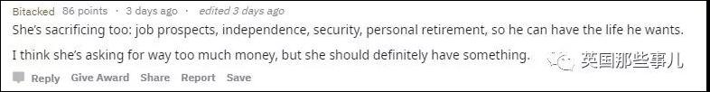 “她也犧牲了很多呀:自己的職業前景,獨立,安全性,將來的退休金,這樣他丈夫才能追逐自己想要的生活。我也覺得她要的錢太多了,但她的確應該得到點兒東西。”
